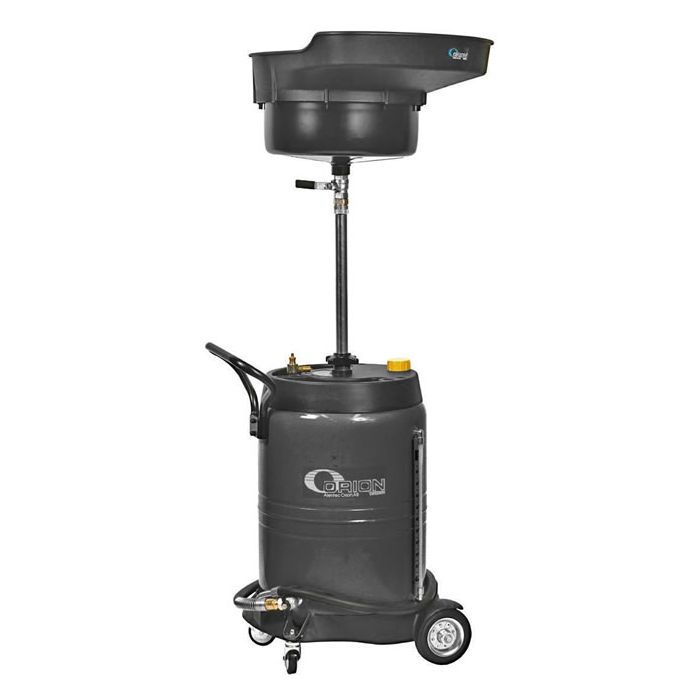 Waste Oil Container. 100 litres. Standard with a unique bowl design. The container is fitted with an asymmetric swivelling bowl with a specially designed anti splash mesh. The top of the container has a fixed tray for tools, washers, oil plugs etc. The base has a special outlet hose holder.