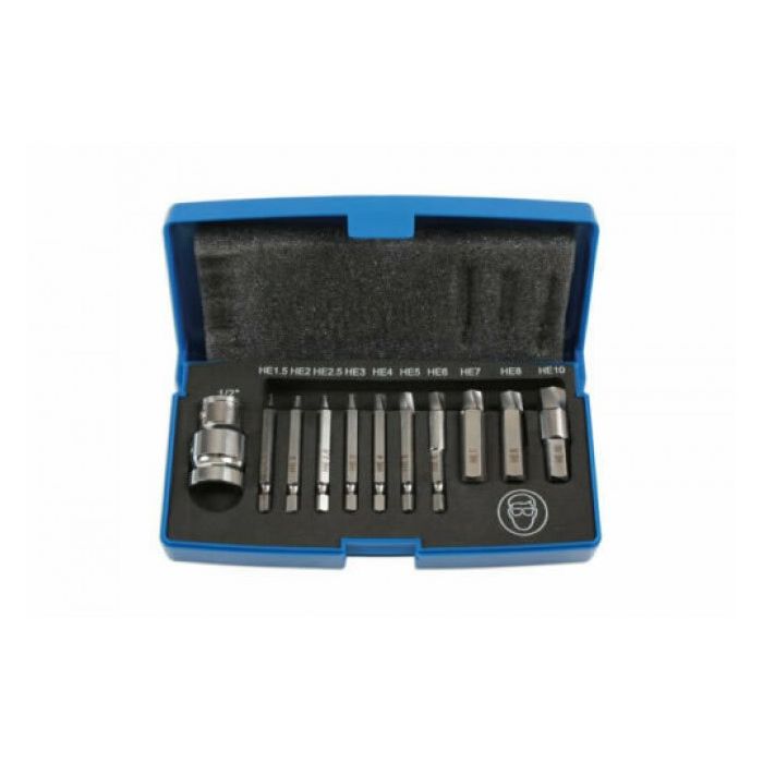 Damaged Hex Cap Head bolt and screw extractor set 1/4" Hex shank: 1.5mm, 2mm, 2.5mm, 3mm, 4mm, 5mm, 6mm and 10mm Hex shank: 7mm, 8mm, 10mm. 1/2"D x 10mm Hex bit adaptor For removing damaged hex bolts and screws