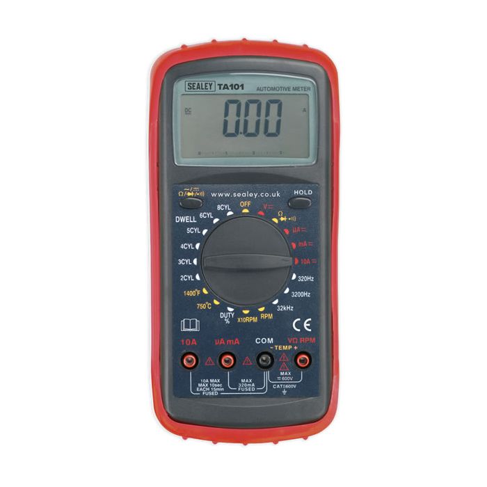 • Durable case and integral stand suitable for the toughest workshop conditions. • Large, high-contrast LCD display with 18mm high digital read-out and analogue bar graph. • Includes auto-ranging, data-hold, auto-polarity, auto-power-off and low battery display functions. • Bar graph simplifies lambda sensor testing. • Supplied with capped test probes and K-type thermocouple.