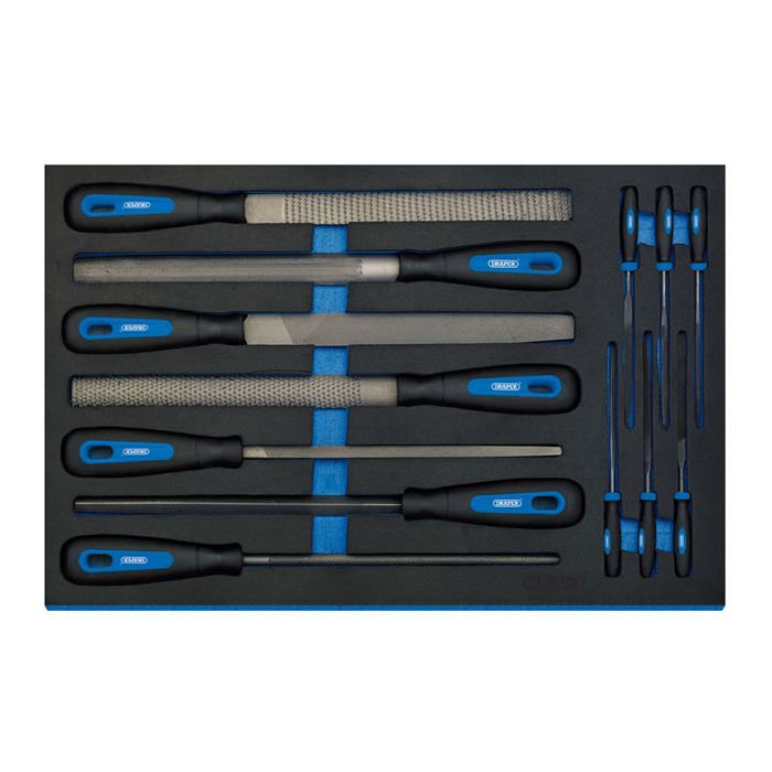 Files manufactured from high quality carbon steel, which is correctly hardened and tempered. Fitted to soft grip handles for added user comfort. Supplied complete in a two tone 3/4 drawer EVA insert tray made from closed cell foam. Suitable to be used in Draper and Draper Expert tool chests and other manufacturers similar tool chests.