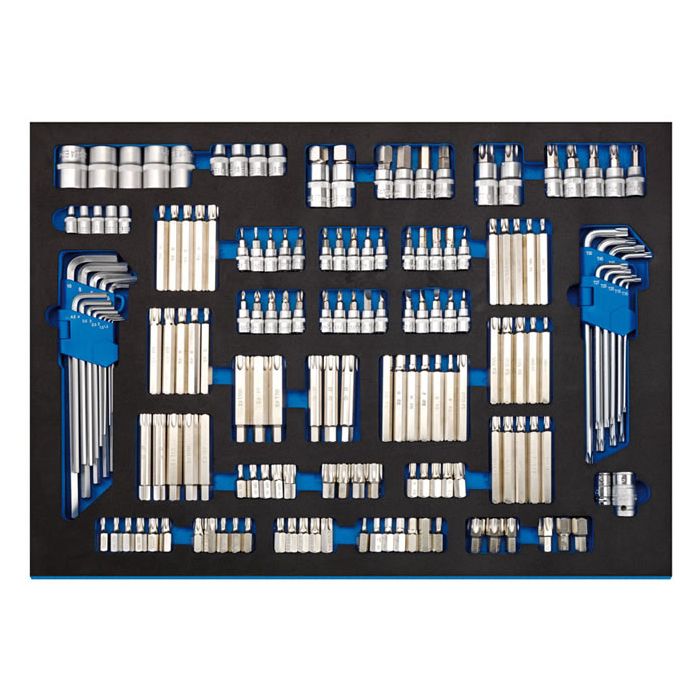 Expert Quality, selection of bits for automotive and workshop use, manufactured from S2 steel, which is correctly hardened and tempered, with a satin chromed finish. Supplied complete in a two tone full plus drawer EVA insert tray made from closed cell foam. Suitable to be used in Draper and Draper Expert tool chests and other manufacturers similar tool chests.