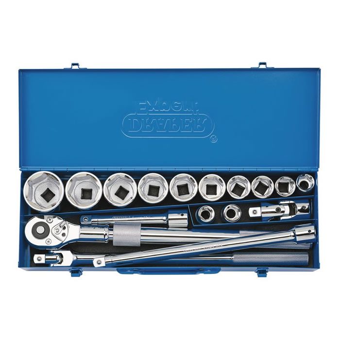 Expert Quality, six point sockets made from chrome vanadium steel that's hardened and tempered with a polished finish. Supplied with an extending reversible ratchet. Each socket has a knurled ring for extra grip. Packed in a steel carrying case.