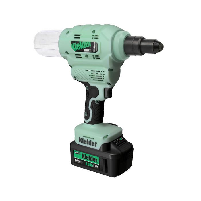 Heavy-duty 18v Brushless Riveter with huge capacity for up to 6.4mm rivets. Designed for daily use in industry, it boasts a powerful pulling force of 9000Nm and 23mm stroke length. The high performance brushless motor and precision engineered internal mechanism provides long service life. Also features soft grip handle and removable chamber, at rear of tool, to collect spent rivet shafts. Supplied with four interchangeable front nozzles for various rivet sizes, from 2.4mm to 6.4mm, plus tool for quick nozzle change. Fully compatible with Kielder TYPE18 interchangeable battery system.