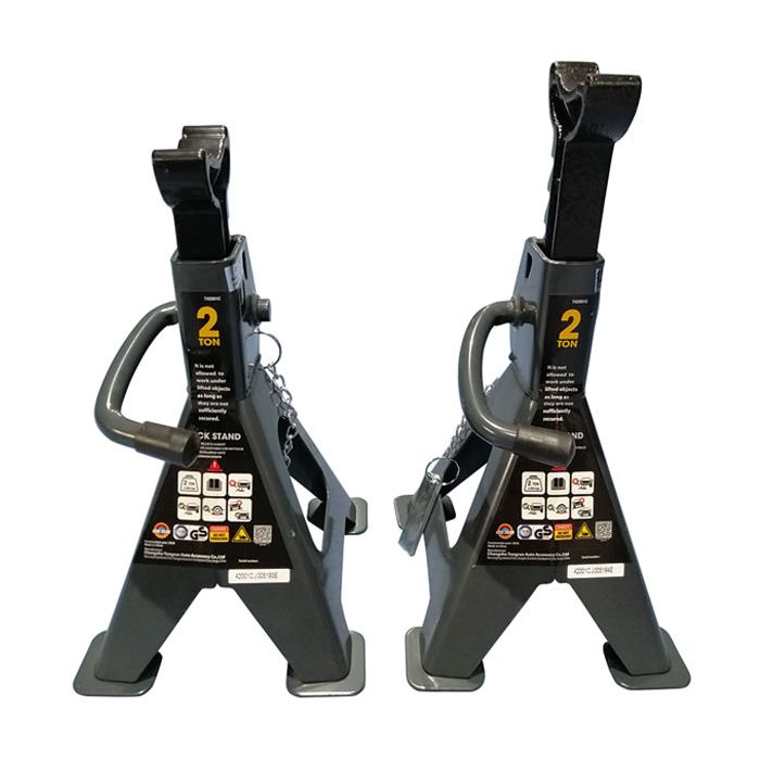Ratchet style axle stands with cast iron centre column and support saddle. Heavy duty steel welded base with large feet area to prevent sinking into the ground. Special angled teeth in the post prevents accidental release of load - and for extra safety measures a pin and chain is provided to prevent accidental release of the saddle.