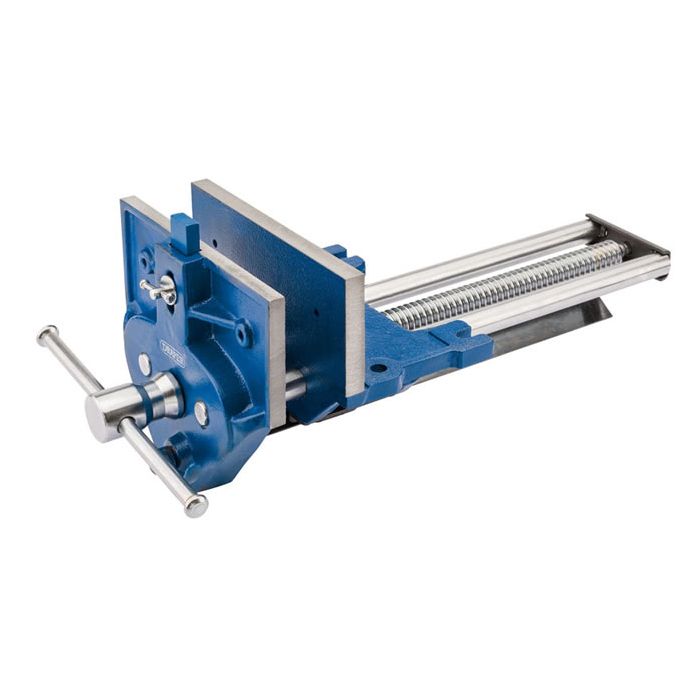 Robust, close grain cast iron woodworking bench vice fitted with quick release mechanism to allow jaw to slide freely along the buttress thread screw. When used with a bench stop, larger workpieces can be held using the adjustable front dog. Carton packed.