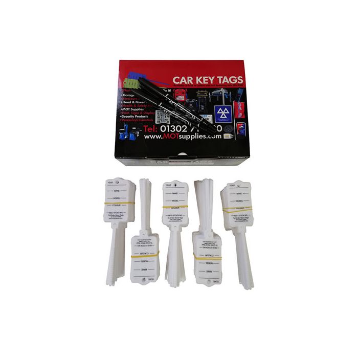 Stiff, durable vinyl blue plastic key tags with plastic tails