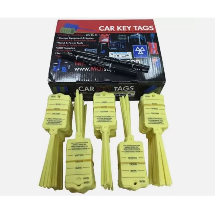 Stiff, durable yellow vinyl plastic key tags with plastic tails
