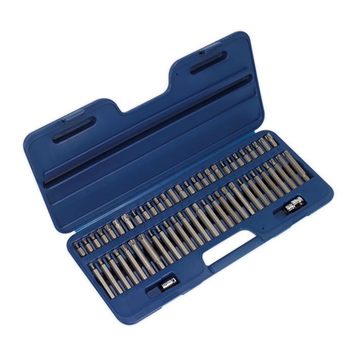 • One of a comprehensive range of Premier Hand Tools, suitable for daily professional use. • Chrome Vanadium 6150 steel bits, each size in 30 and 75mm lengths. • Set includes 3/8" and 1/2"Sq drive to 10mm hex Chrome Vanadium steel adaptors. • Supplied in storage case with inclined trays for quick and easy bit selection. • Contents: Security TRX-Star* Bits; T20H, T25H, T30H, T40H, T45H, T50H, T55H, T60H (1 each 30 and 75mm), Hex Bits; 4, 5, 6, 7, 8, 10, 12mm (1 each 30 and 75mm), Ribe Bits; M5, M6, M7, M8, M10, M12, M14 (1 each 30 and 75mm), Spline Bits; M5, M6, M8, M10, M12 (1 each 30 and 75mm), Drive Adaptors; 3/8"Sq x 10mm Hex, 1/2"Sq x 10mm Hex. • Lifetime guarantee*.