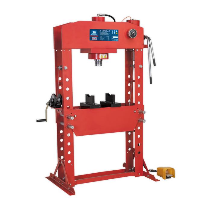 Heavy duty steel frame construction with side mounted air motor powering hydraulic pump unit.