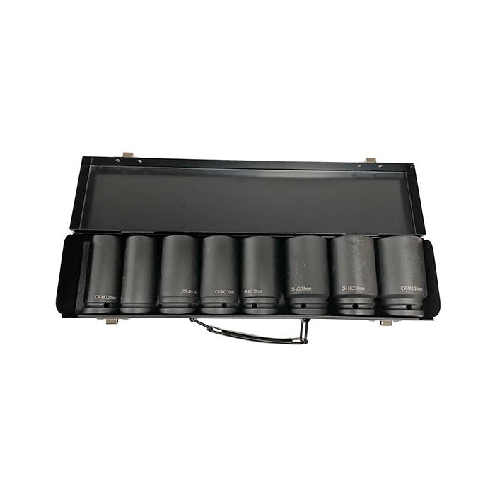 Quality 8 pc 3/4” Drive Deep Impact Socket Set. Manufactured from chrome vanadium steel and drop forged with a black corrosion resistant finish.