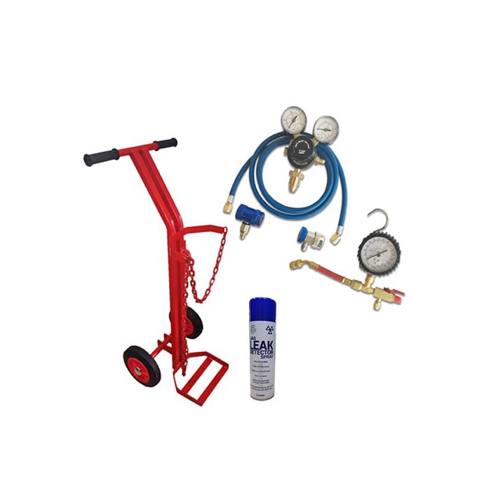 The kit comprises: AC2092GB regulator, 2 metre hose, R134a & R1234yf service couplers, and the AC2094 N2 Test gauge hose & ball valve unit as well as a top quality trolley for the gas bottle.