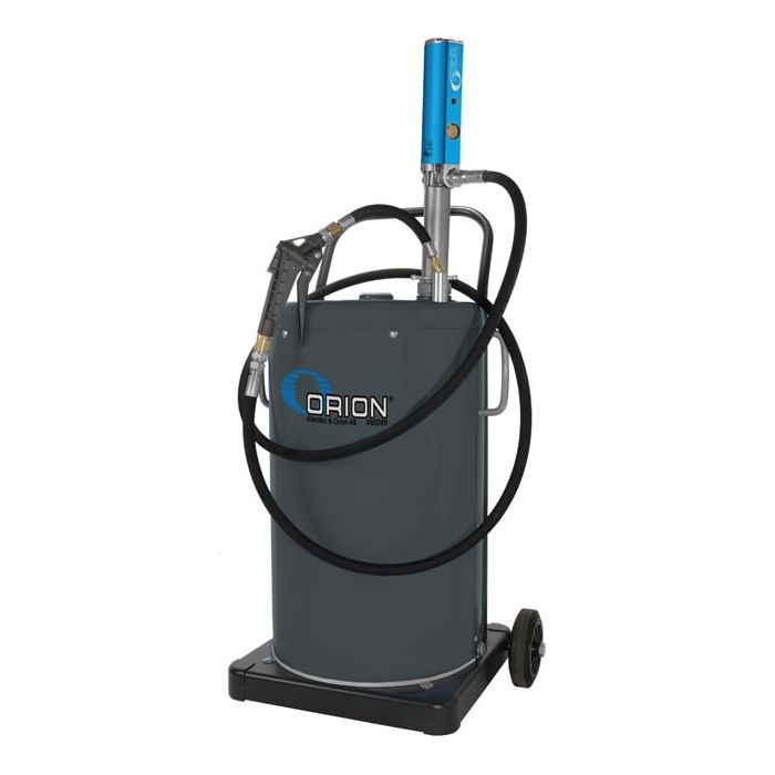 De-Luxe Mobile Oil Dispenser. For 60 litre drums.Consisting of a air operated pump, fitted to the lid of a protective container, oil hose and oil control valve. The container is mounted on a trolley fitted with two large rubber wheels and two swivel castors.