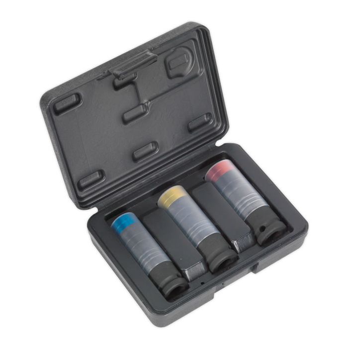• Each socket is sleeved and has an insert to prevent damage to alloy wheels and nuts.
