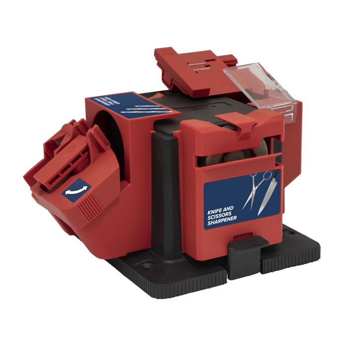 • Portable electric multipurpose sharpener. • Aimed at the DIY user. • Sharpens all HSS drill bits from Ø3-13mm, straight edged knives and scissors. • Also re-grinds chisels and plane blades up to 50mm wide. • No-Load Speed: 6700rpm. • Wheel Diameter: Ø51mm.