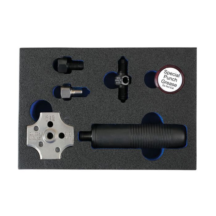 The set includes dies and punches for the two most common brake pipe sizes: 4.75mm and 3/16" diameter and can produce both DIN single flares and SAE double flares.