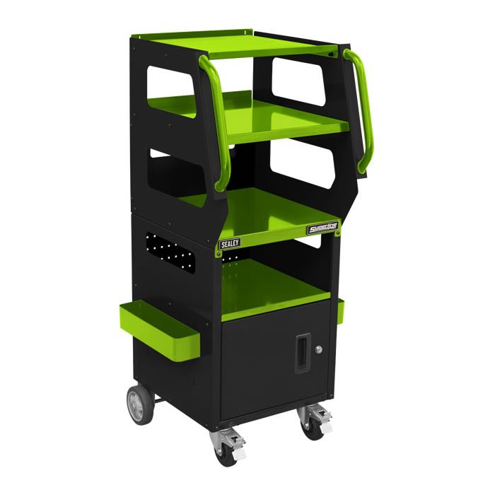 • Four open shelves with 10mm EVA liner on top shelf and a lockable compartment; makes it suitable for storing laptops, testers, leads and battery chargers.
