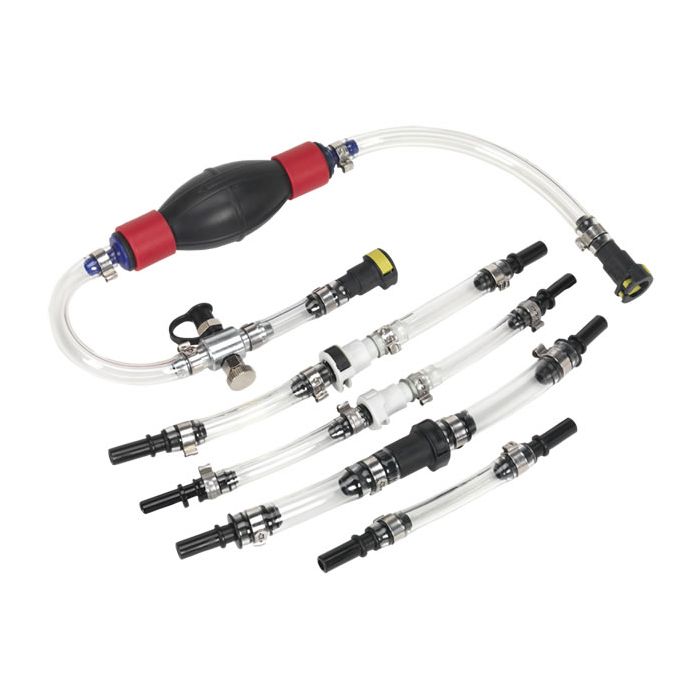 Clear pipes allow visual detection of any air within the fuel system or any air being inadvertently drawn into the fuel line. Includes a valve to work in conjunction with Ford IDS diagnostic equipment, allowing the vacuum to be monitored.