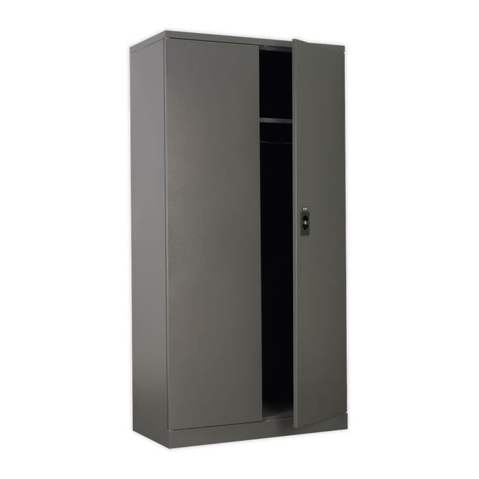 • Featuring two large doors, three half shelves, one full shelf, clothes hanger and divided base storage.