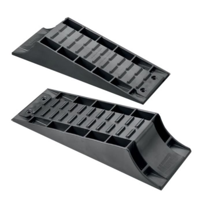 The curved rear end of the ramp allows the leveller to be inserted between 2 wheels of some twin axle caravans
