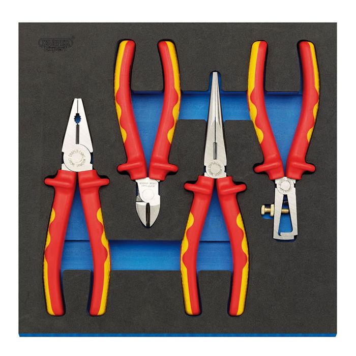 Expert Quality, VDE pliers manufactured from drop forged chrome vanadium steel, which is correctly hardened and tempered with additionally induction hardened cutting edges with lacquered finish. Each plier has been tested to 10,000V AC or 1500V DC live line working. Fitted with fully insulated soft grip handles. Supplied complete in a two tone 1/2 drawer EVA insert tray made from closed cell foam. Suitable to be used in Draper and Draper Expert tool chests and other manufacturers similar tool chests.