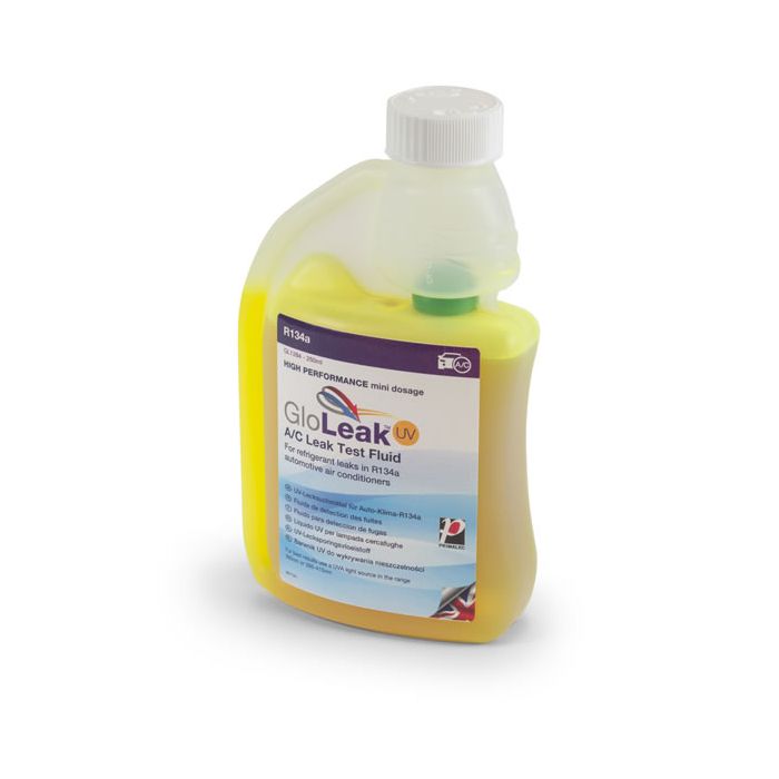 Suitable for R134a (& legacy R12) systems Glo-Leak® Pure 1284 is for R134a automotive a/c systems. The recommended dosage is just 5ml per 250ml of lubricant, and it is much stronger than most rival products. Use GL1284 when adding dye via your A/C service machine, or when mini doses cannot be measured accurately, or when price per bottle is paramount. Also good for use with Primalec injectors.