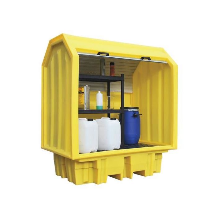 Manufactured from 100% recyclable polyethylene for broad chemical compatibility this unit has a lockable roller-top door to prevent unauthorised access and integral base fork pockets to aid transportation.