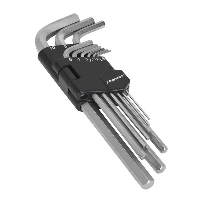 • Manufactured from heat treated and hardened Chrome Vanadium steel with satin chrome finish. • Keys range in length from 79mm to 180mm and in size from 1.5mm to 10mm. • Supplied in easy-access case with hanging tag for safe storage and quick key selection. • Contents: 1.5, 2, 2.5, 3, 4, 5, 6, 8, 10mm.