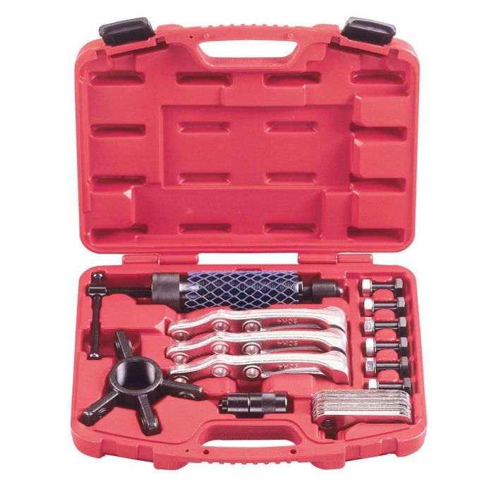 This tool is designed to pull bearings, pulleys and the like from shafts. The jaws are designed to grip the bearing from the outside or inside, whichever offers the better grip. The piston will push on the central shaft while the jaws pull away. This will keep the item in alignment with the shaft as it is removed. Keeping the bearing aligned prevents binding and possible damage to the bearing.