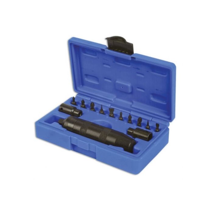 Contents: 3/8"D impact driver, 3/8"D x 5/16" bit holder, 3/8"D x 1/4" bit holder. Bits: 1/4" shank x 22mm Flat: 4mm | 6mm, 1/4" shank x 25mm Phillips: Ph1 | Ph2 | Ph3, 5/16" shank x 32mm Phillips: Ph1 | Ph2 | Ph3, 5/16" shank x 38mm Flat: 10-12 | 14-16mm.