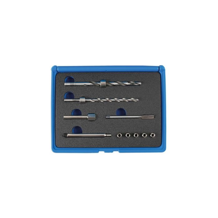 • Contents: M8x1.0mm Tap, 7-8mm step drill, 6mm drill, Drill guide, insert fitting tool & 5x threaded inserts