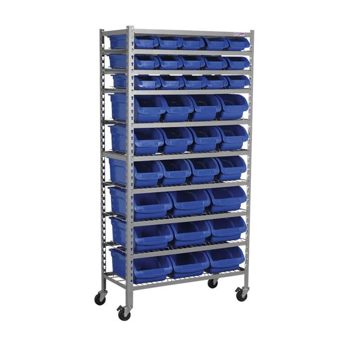 • Powder coated steel rack with thirty-six robust composite storage bins evenly spread across nine shelves.