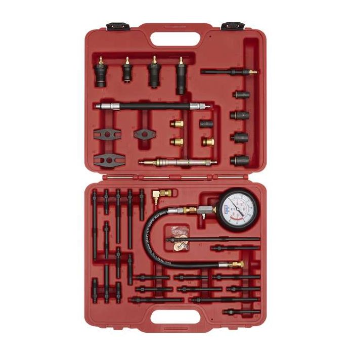 Features 600psi gauge with large rubber bumper, straight and right angled quick connect fittings and an extensive range of spark/glow plug and injector adaptors.