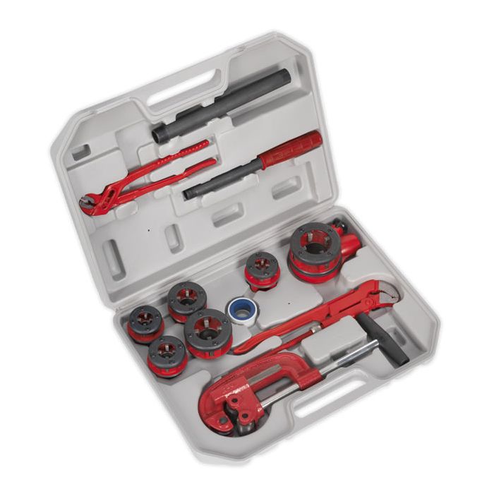Contents: Ratchet Die Stock, Dies; 1/4", 3/8", 1/2", 3/4", 1", 1-1/4", Pipe Cutter #2 10-60mm, Bent Nose Pipe Wrench 1", Teflon Tape 0.1mm x 26mm x 20mtr, Two-piece Handle, Water Pump Pliers