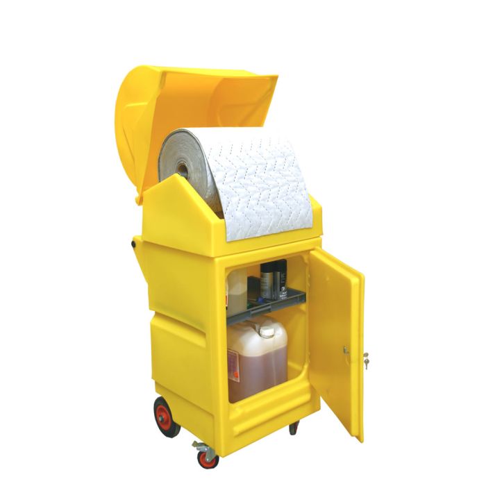 The unit has secure internal storage for drums and containers with a convenient slotted opening in the door for gloves and manuals. The top of the unit is complete with a roll holder and hinged lid. the roll holder is suitable for absorbent rolls, general paper rolls or wipes..