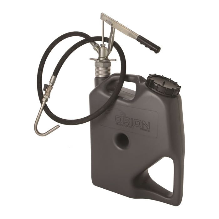 Fitted to a 16 litre Orican container with carrying handle. Supplied with a 1.5 Metre hose and angled outlet tube.