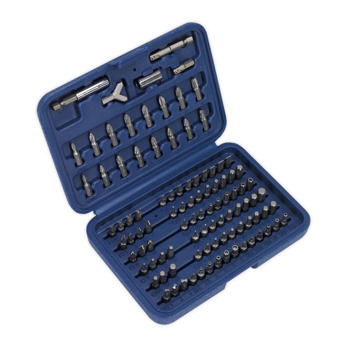 Contents: Bits; Slotted Screwdriver (x9), Phillips Screwdriver (x8), Pozi Screwdriver (x8), TRX-Star* (x9), Security TRX-Star* (x9), Hex - Metric (x9), Hex - Imperial (x9), Security Hex - Metric (x6), Security Hex - Imperial (x6), Butterfly (x3), Spanner (x4), Spline (x3), Square (x4), Torq (x3), Tri-Wing (x4), Special Hook Bit, Magnetic Extension/Bit Holder, 1/4"Sq Drive Extension, 1/4"Sq Drive Socket Adaptor (x2)