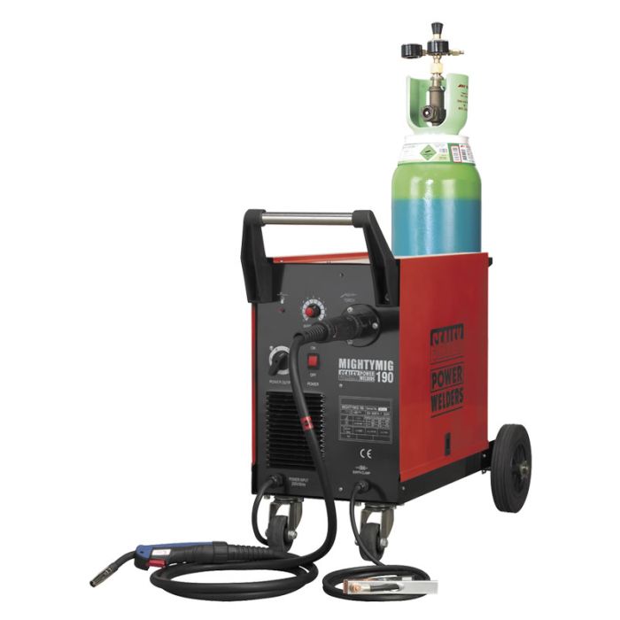 One of our professional MIGHTYMIG range this large gas/no-gas welder offers excellent performance at an extremely competitive price. This unit is set up ready to go in gas mode but can also be switched easily to use gasless by a simple change of polarity. Supplied with high quality cool running BINZEL® MB15 Euro torch, 1.8mtr earth cable, 1.4mtr gas hose, 1kg spool of 0.6mm wire, 0.6 & 0.8mm contact tips. Welders are illustrated with gas bottles to give an indication of size only; gas is not included. A contract for the supply of gas should be arranged with your local gas dealer.