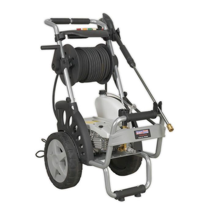 • Fitted with 10mtr hose reel, built-in pressure gauge, adjustable pressure controls and 3ltr detergent tank.