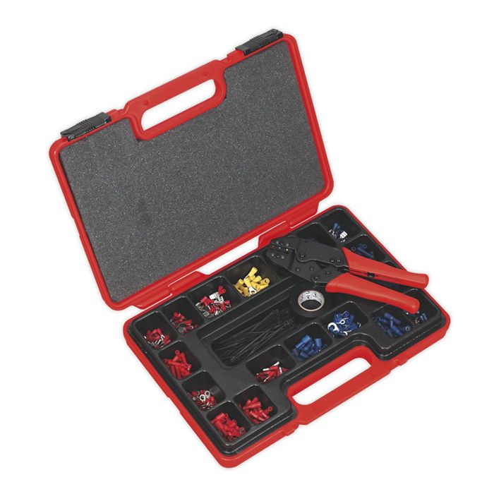 Contents: Crimping Tool, Assorted Insulated Terminals (x500), Cable Ties (x50), Insulating Tape