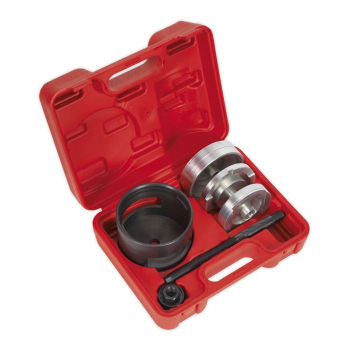 For the safe removal & installation of the rear axle carrier bushes on BMW X5 Models. It can be used in situ without removing the rear subframe assembly from the vehicle. Use with a 24mm spanner wrench only. Supplied in carry case.