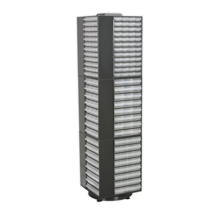 • Freestanding rotating cabinet system featuring twelve cabinet boxes with three different drawer configurations.