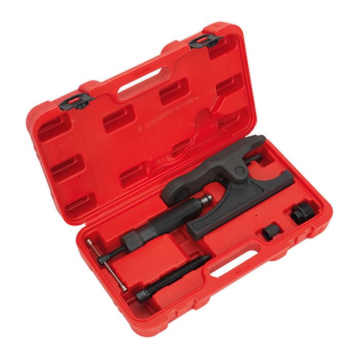 • Heavy-duty ball joint splitter suitable for commercial vehicles. • Specially designed to be operated manually or by 10tonne hydraulic ram (supplied). • Features a step down thread adaptor that allows fitting of the manual thrust screw or hydraulic ram. • Hydraulic ram interchangeable with Model No. PS990.