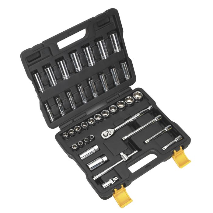 Contents: 3/8”Sq Drive WallDrive® Sockets; Standard & Deep - 8, 9, 10, 11, 12, 13, 14, 15, 16, 17, 18, 19, 21, 22, 24mm, Spark Plug Sockets; 16mm (10mm Plug), 21mm (14mm Plug), Flip Reverse, Quick Release Ratchet Wrench, Extension Bars; 75, 100, 150mm, T-Bar and Sliding Adaptor, Universal Joint