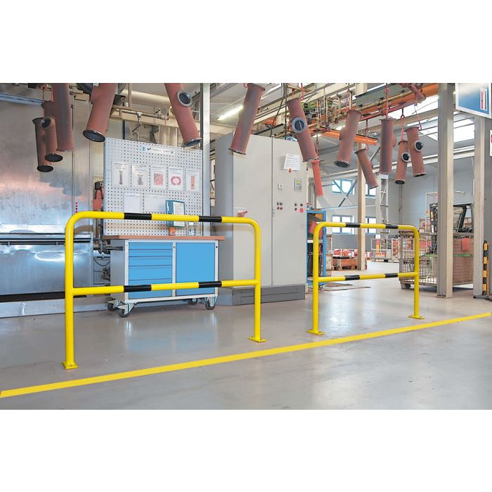 Formed steel tube with additional reinforcing crossbar. Finished in signal yellow with black stripes. For surface mounting with heavy duty base plates (70/60/10 mm) drilled for fixing bolts. (Bolts supplied on request at extra cost).