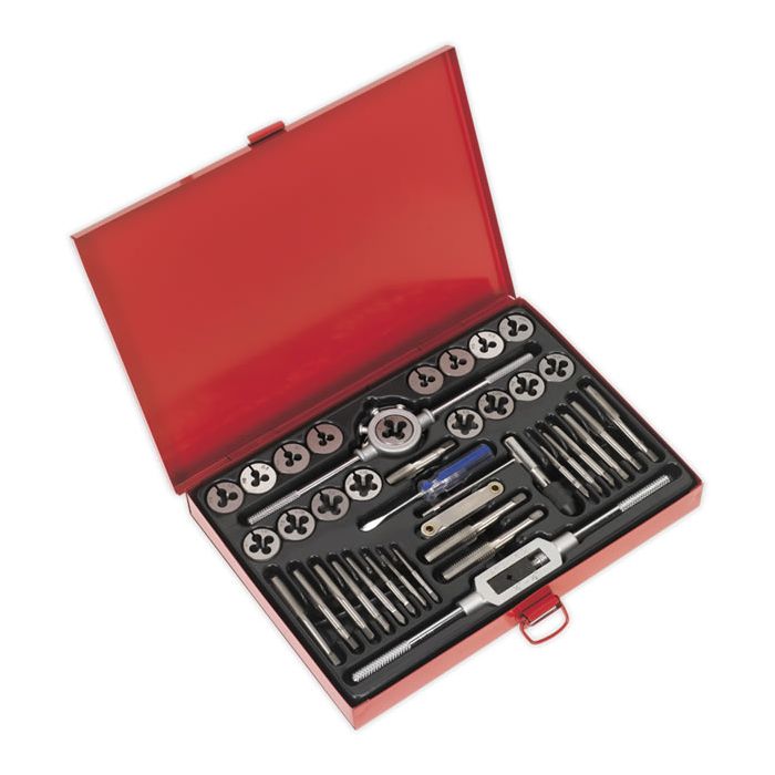 Contents: Taps & Dies; 3 x 0.5, 3 x 0.6, 4 x 0.7, 4 x 0.75, 5 x 0.8, 5 x 0.9, 6 x 0.75, 6 x 1, 7 x 0.75, 7 x 1, 8 x 1, 8 x 1.25, 10 x 1.25, 10 x 1.5, 12 x 1.5, 12 x 1.75mm, 1/8"NPT, Tap Wrench, T-Bar Tap Wrench, Die Holder, Screwdriver, Thread Gauge