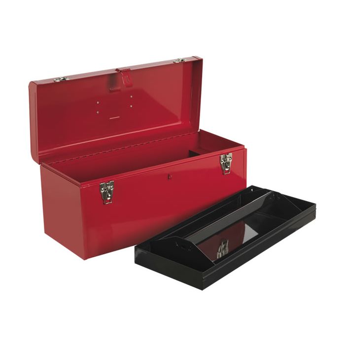 • Heavy-duty steel toolbox with integral tote tray and composite carry handle.
