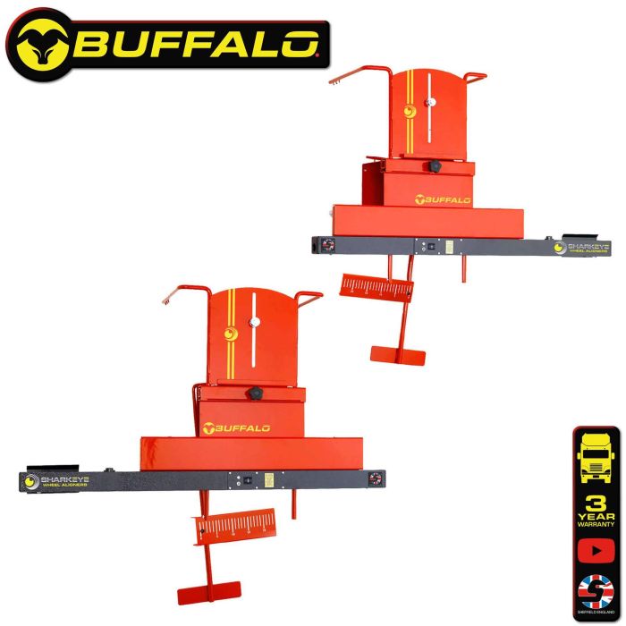SharkEye Buffalo SINGLE STEER Laser wheel alignment tool - HGSSLA by Sharkeye Wheel Aligners UK Ltd If you have a fleet of single steer trucks or buses; these are the gauges for you. Keenly priced, superior build quality and easy to use. What's not to like. But best of all, these gauges will stop you wasting so much money. So much money in fact it's staggeringly frightening. Typical proven savings: 3-5% fuel and 10-20% tyre wear. That's real food for thought. Like all SharkEye laser aligners its simple but effective design allows accurate alignment in practically any environment. Minimal moving parts, no wires, pin sharp laser images and rechargeable batteries all add up to one seriously versatile Truck Wheel Aligner. Includes: 2 x Heavy Duty Dished Turnplates Calibration Rig included for self-calibration 6 x 40mm Rim Button Extensions 3 year parts and labour warranty