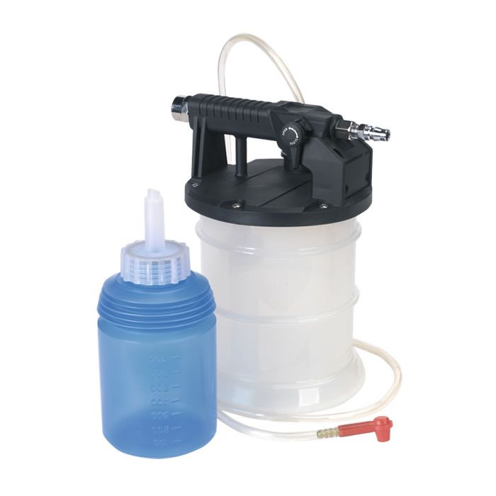 Easy, fast, one-man operation using workshop air supply (90psi). Does not require vehicle-specific reservoir caps. Draws fluid from the bleed screw enabling either bleeding or full replacement of fluid in system. Operation automatically stops when 2ltr tank is full, preventing spillage. Includes reservoir-replenishing bottle, instructions and airline quick connector.