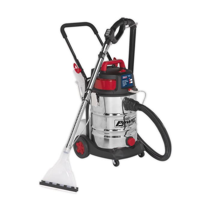 • High powered unit ideal for cleaning carpets, car interiors, fabrics and upholstery. • Supplied with carpet lance, hand-held lance, full wet and dry vacuum accessory kit including stainless steel rigid extension tube, cartridge filter and foam filter. • Large capacity drum with external detergent tank for easy filling. • Features remote operation controls on nozzle, enabling switching between vacuum and detergent modes uninterrupted. • Fitted with two fixed wheels and two castors, cable storage hooks and accessory storage slots. • Order Sealey detergents Model No's VMR921S 1ltr or VMR925S 5ltr.