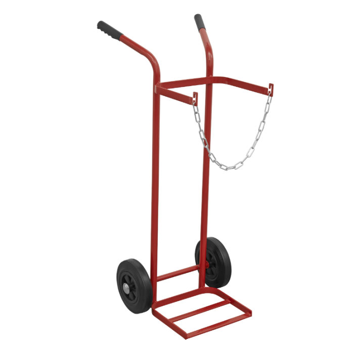 Lightweight tubular steel frame with large wheels for easy transportation of heavy cylinders.